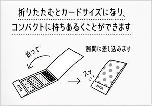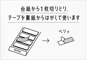 - カードサイズの台紙に、5cmの長さにカットされた裏紙付きのマスキングテープが収納されており、台紙から1枚ずつ切りとって裏紙からはがして使用します。表紙を折りたたむとカードサイズになるため、手帳などのポケットに入れてコンパクトに持ち歩くことができます。また、裏紙が付いているため、マスキングテープをきれいな状態で人にあげたり、交換できます。