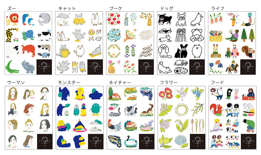 シールのイラストは動植物や人物など全10種類で、ページの角や隙間に貼りやすいように形が工夫されています。また各シールにはシークレット柄が1枚ずつ付いています。