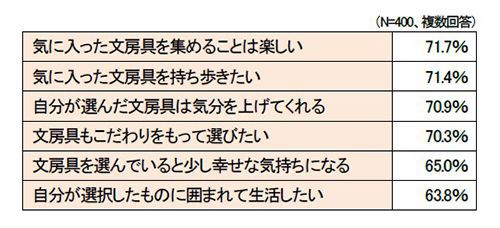 「生活や文房具に対する気持ち」(複数回答)を聞いたところ、7割以上が「自分が選んだ文房具は気分を上げてくれる」、「文房具もこだわりをもって選びたい」、「気に入った文房具を集めることは楽しい」などと回答しました。