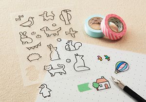 透明なシートに印刷された枠線に合わせて、手持ちのマスキングテープを切り貼りしてオリジナルシールを作れます。マスキングテープの色や柄を組み合わせ、ぬりえ感覚で楽しめます。全14種類を展開中。
