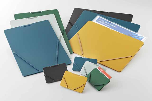 サイズは、書類やクリアーホルダーの収納に適したA4ヨコ型/タテ型と、名刺やポイントカードの整理に便利なカードサイズの3種類で、カラーはそれぞれキイロ、ミドリ、アオ、グレー、クロの5色展開です。