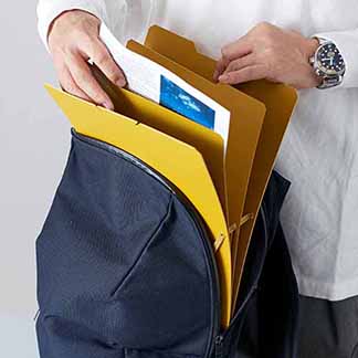 「SAND IT(サンドイット)」は、書類などを投げ入れるだけで簡単にファイリングでき、ゴムの伸縮で最適な厚さになる新しい形のドキュメントホルダー、カードホルダーです。書類だけでなく、クリアーホルダーや厚みのある小冊子も収納できます。また、インデックスが2枚入っているため、収納物を大まかに分類することも可能です。