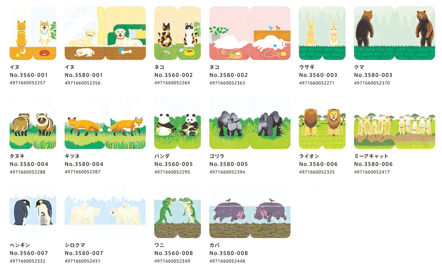3560 | Mサイズ | 27×47mm | 30枚 | イヌ、ネコ、ウサギ、タヌキ、 パンダ、ライオン、ペンギン、ワニ |
