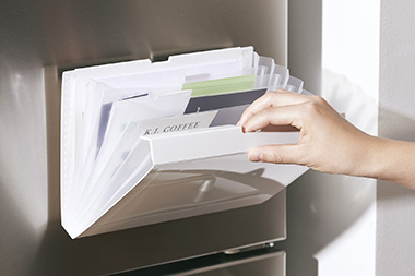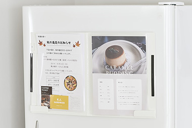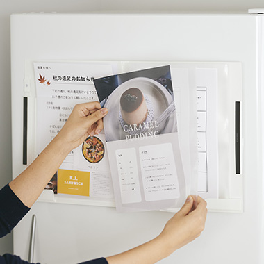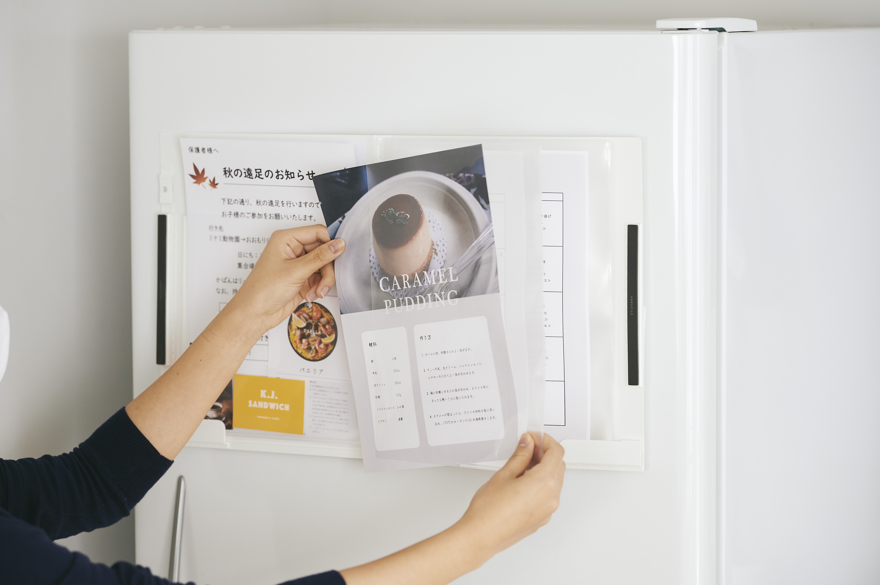 冷蔵庫の扉などに紙類を貼って閲覧する方は多く見受けられますが、子供が通う学校の連絡書類やクーポン・領収書・レシピなどといった大きさの異なる用紙を多数貼り付けると、「見た目が良くない」「必要な用紙がどこにあるかわからない」などといった不満があります。