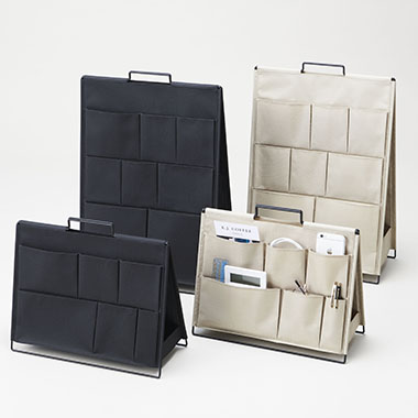 様々なサイズのポケットが付いており、電卓やリモコンのほか、雑誌やパソコンなど大きなものも収納できます。また、広げた内側にはティッシュボックスやスプレーボトルなど、厚みがあるものも収納可能です。