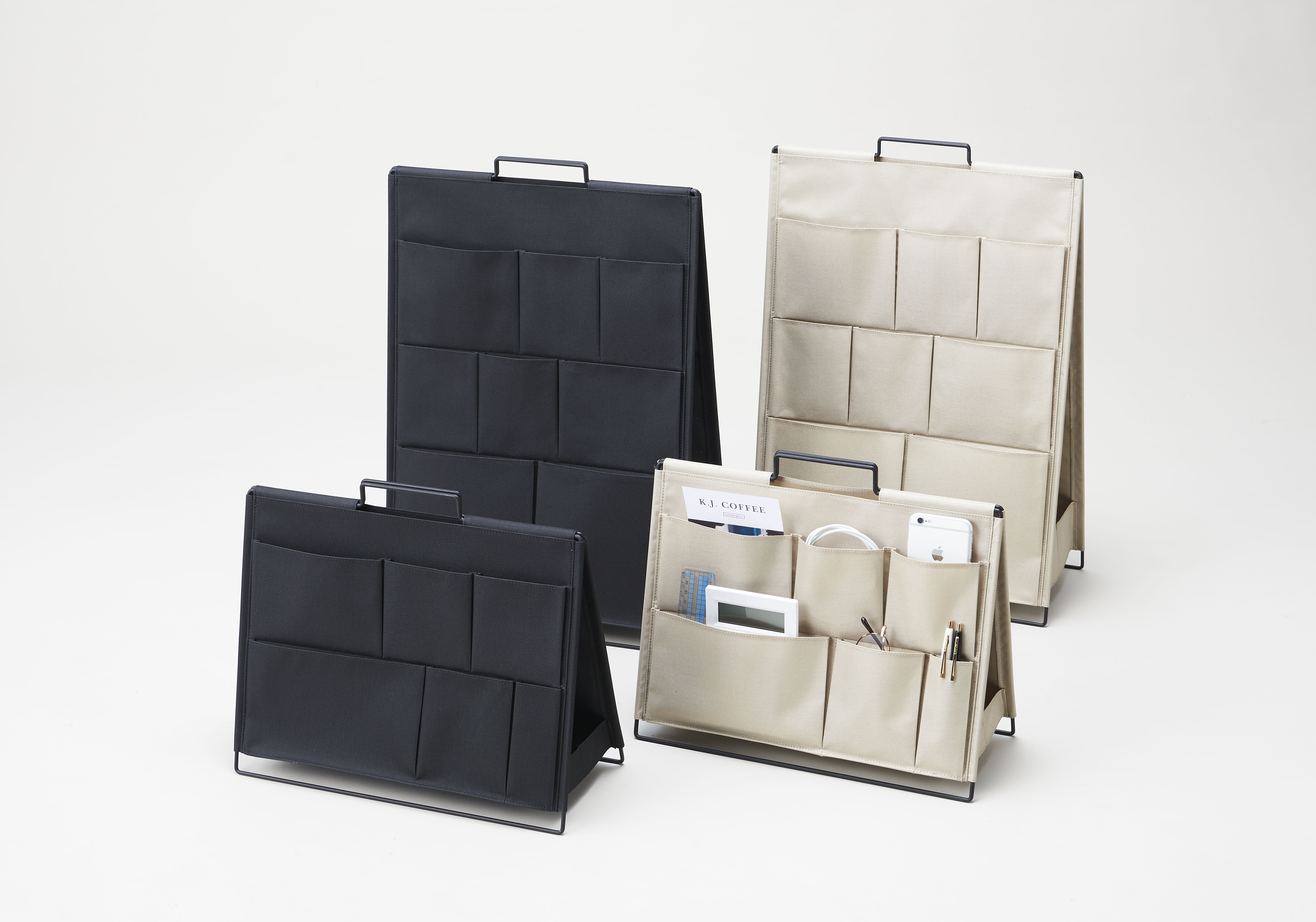 「ツールスタンド」はこのような不満を解消した、手の届く範囲に置ける立て看板のような収納スタンドです。サイズの異なるポケットが豊富に付いているので、収納物の大きさに合わせて整理できます。本体には取っ手が付いているため持ち運びやすく、使わないときはコンパクトに畳んで棚のすき間などに収納できます。