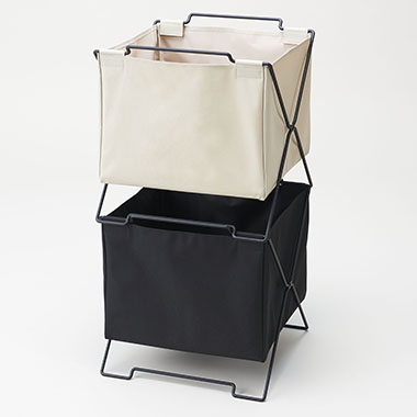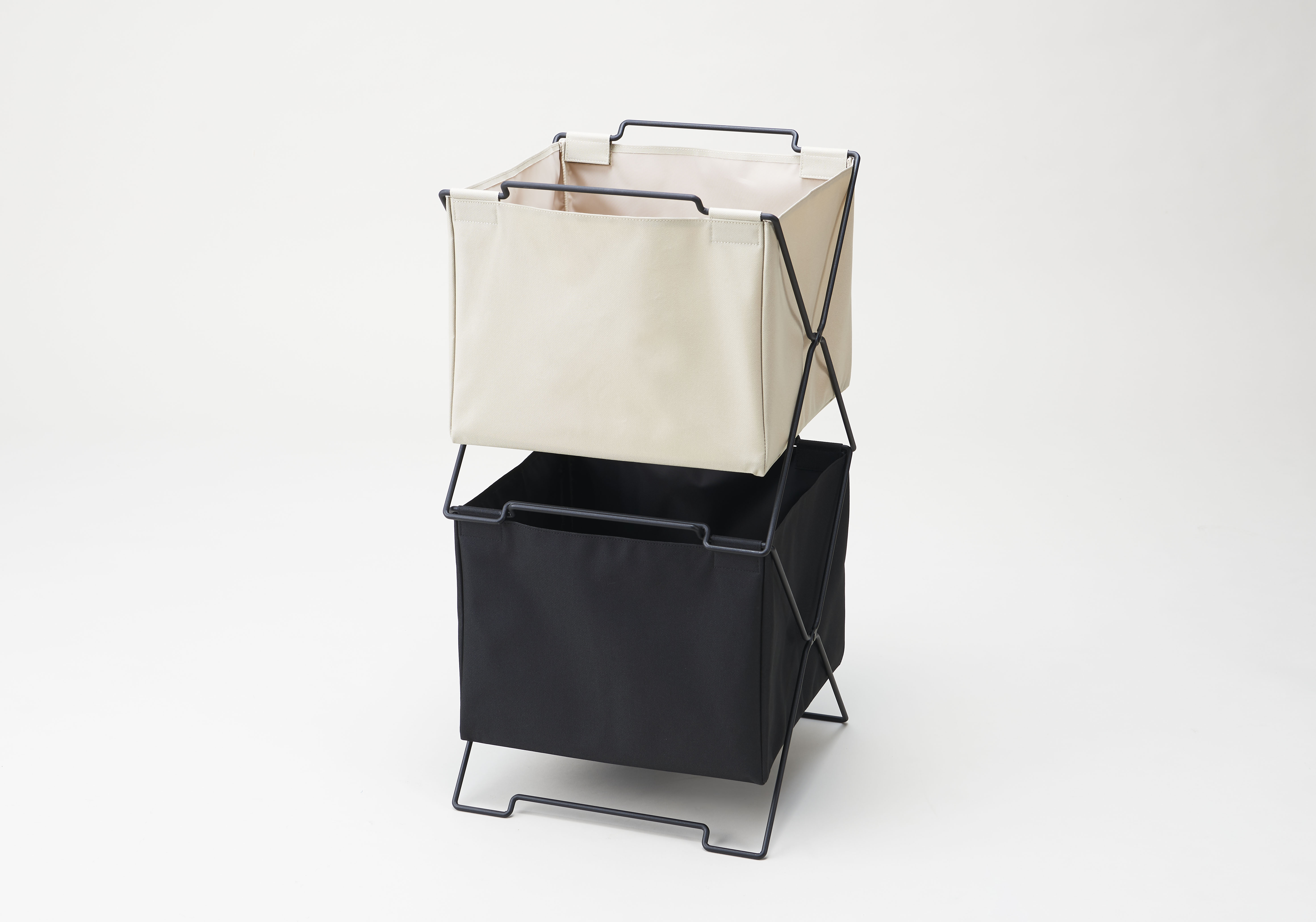 「スタックバスケット」はこのような不満を解消した、積み重ねることで空間を有効活用できる収納バスケットです。スチール製のフレームを採用し、荷物を入れた状態でも安定して2段の積み重ねが可能です。また、積み重ねた状態からでも、下のバスケットに収納した物の出し入れがしやすい構造です。