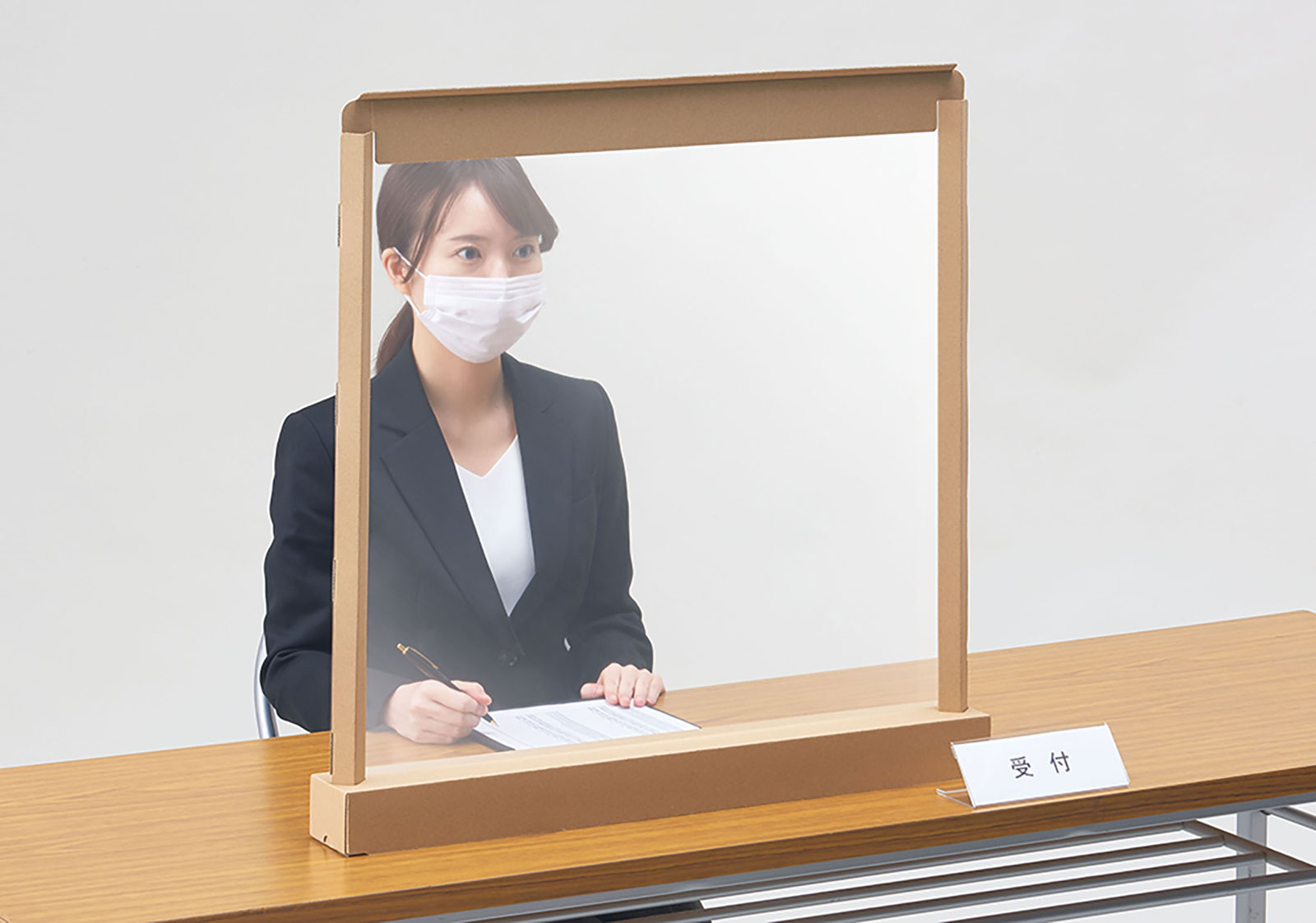 「巻き取り式フィルムパーティション」は、段ボール製のフレームに巻き付けられたOPPフィルムを広げて、台座に差し込むだけで簡単に設置ができるパーティションです。1個あたり約280gと軽量で持ち運びやすく、組み立て式なので保管場所も取りません。