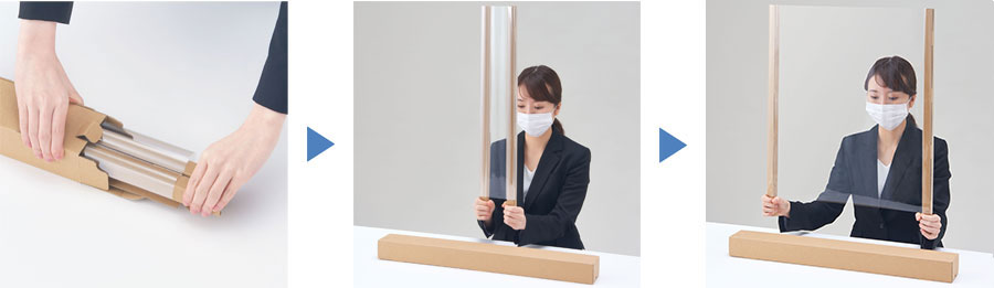 - あらかじめ段ボールに巻き付けられたフィルムを広げて台座に差し込み、上部に補助パーツを取り付けるだけで簡単に設置ができます。フィルムの収納箱を台座として使用するので設置の際にごみが出ず、無駄がありません。