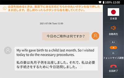 - ペアリングした2台の端末を同じ言語に設定すると自分で発した言葉がリアルタイムで相手の画面に表示される機能を追加しました。例えば、お互い日本語を選択すれば、アクリル板等が設置されているソーシャルディスタンスが必要な場所でも、非接触での対話を円滑にできます。また、会話内容がテキストで大きく表示されるので、高齢者や聴覚障害のある方とのコミュニケーションにも適しています。