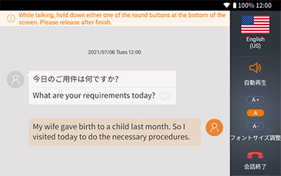 - マイクから30cm程度離れた位置から、会話ボタンを押しながら話しかけます。話し終えたら会話ボタンから指を離します。相手の画面に翻訳結果がテキストで表示され、翻訳内容が音声で発せられます。