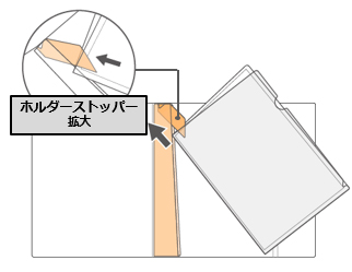 ①ホルダーストッパーにクリアーホルダーの角を挟んで奥まで差し込む