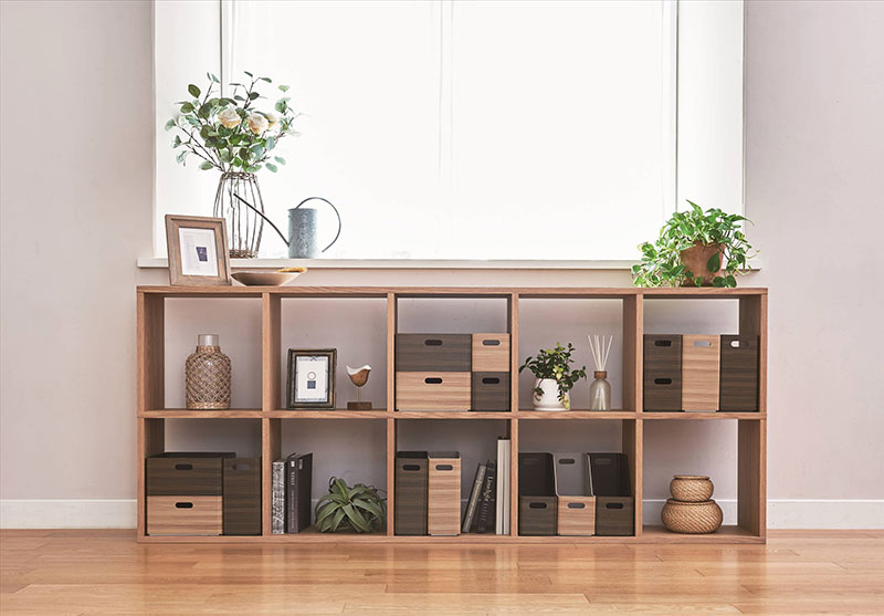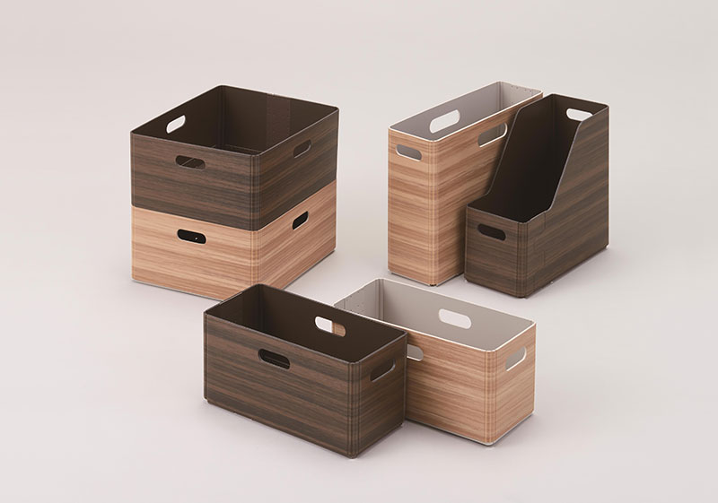 ラインアップは用途に合わせて選べる「キーニ スタッキングユニットボックス」と、「キーニ ボックスファイル」の2種類を用意しました。スタッキングユニットボックスは、積み重ねることができるので、ご家庭の収納スペースに合わせてすっきり収めることができます。ボックスファイルは、A4の書類やファイルの収納に最適なA4ヨコ型です。本体色は、定番のナチュラルとシックなブラウンの2色展開です。