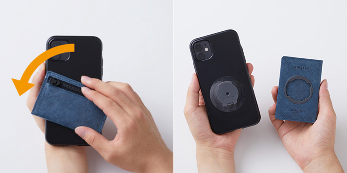 「ウォレカ」は硬貨を入れられるチャック付きのポケットとカードケースが一体となった、スマートフォンに装着できるコンパクトな財布です。現金やカードをかさばらずにスマートフォンと一緒に持ち運べ、キャッシュレス決済も現金・カード決済もこれ1つで対応できます。回転式のレールパーツで簡単に着脱可能で、自宅など財布が必要ないシーンでは簡単に取り外すこともできます。サイズは薄さにこだわったスリムタイプと紙幣も入るスタンダードタイプの2種類で、スリムタイプは2枚、スタンダードタイプは5枚のカードを収納可能。カラーはスマートでビジネスシーンにも馴染む、ベージュ、ネイビー、シルバー、ブラックの4色展開です。