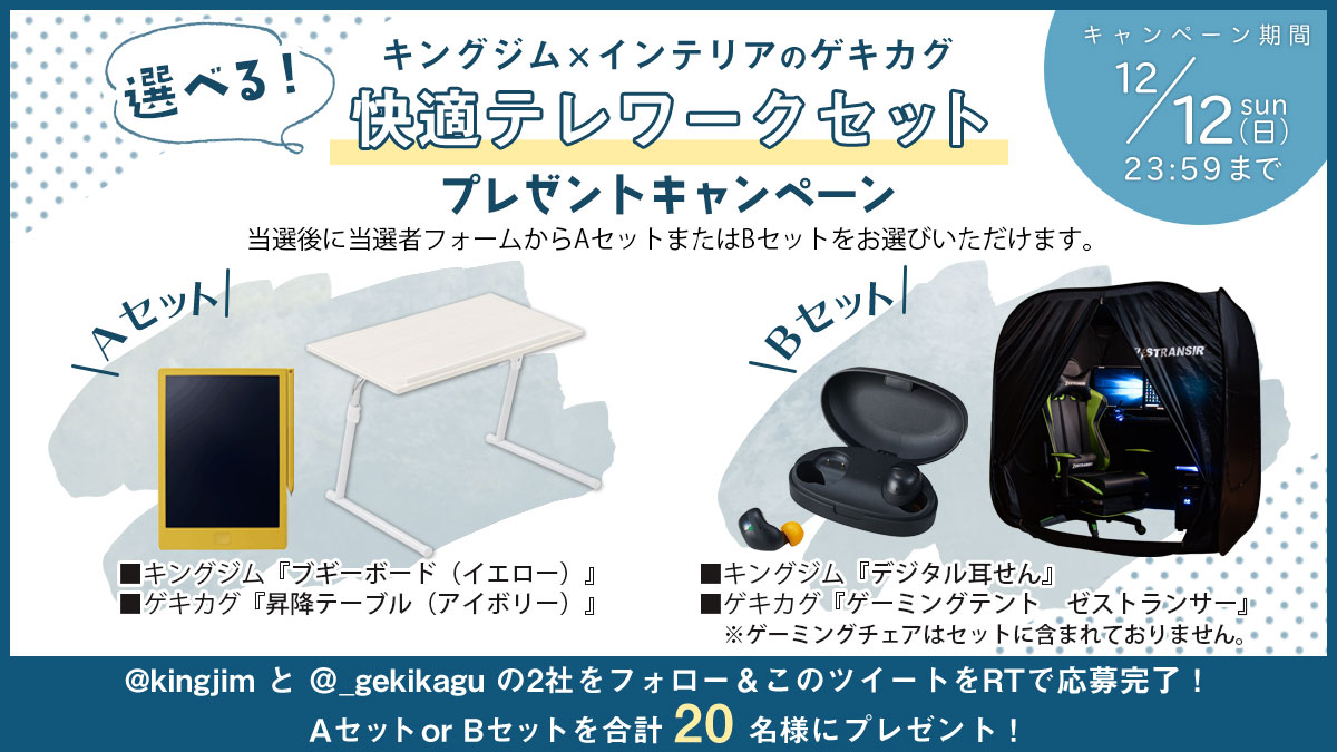 | プレゼント内容 | Aセット 詳細:キングジム「ブギーボード BB-14(イエロー)」、ゲキカグ「昇降テーブル TBL500313(アイボリー)」 Bセット 詳細:キングジム「デジタル耳せん MM3000」、ゲキカグ「ゲーミングテント ゼストランサー ETC001537」 |