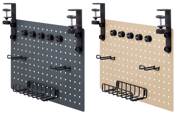 取り付けは机の天板を挟んで固定するクランプ構造で、机の上下に自由に収納スペースをレイアウト可能です。配線を隠す下向き設置、ケーブル類を隠しながら見える部分に小物を収納する中間設置など、簡単にレイアウトをアレンジできます。見せたくないケーブルや小物は裏面にも収納でき、付属のケーブルガイドを使用することで、絡まりがちなケーブルもパネルに沿わせてスッキリと収納可能です。