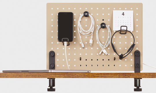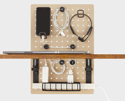 「ルートボード」は、足元や机上に散らかりがちなケーブルや小物をまとめて収納できる、パネル型のケーブルオーガナイザーです。付属のパーツを使用して、用途に合わせた収納スペースをカスタマイズでき、デスク周りの配線や電源をスッキリとまとめられます。