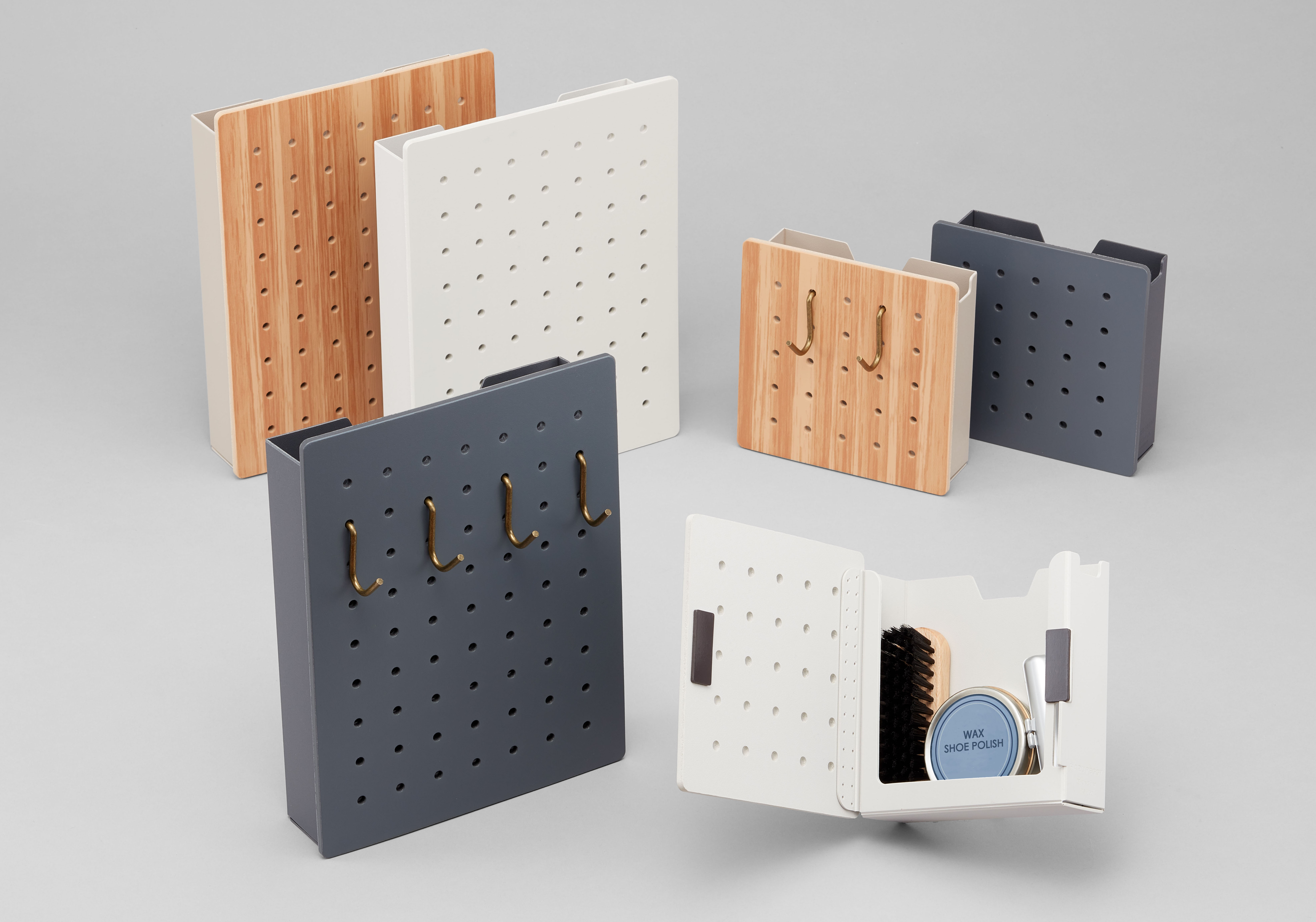 「ハルペギー」は、ペグボードにフックで掛ける"見せる収納"と内側のボックスに"隠せる収納"がひとつになった、工具不要で簡単に設置できる新しい収納グッズです。