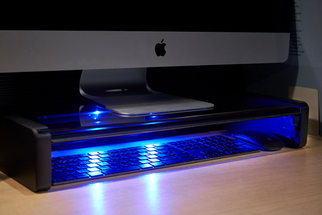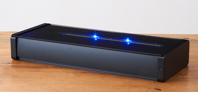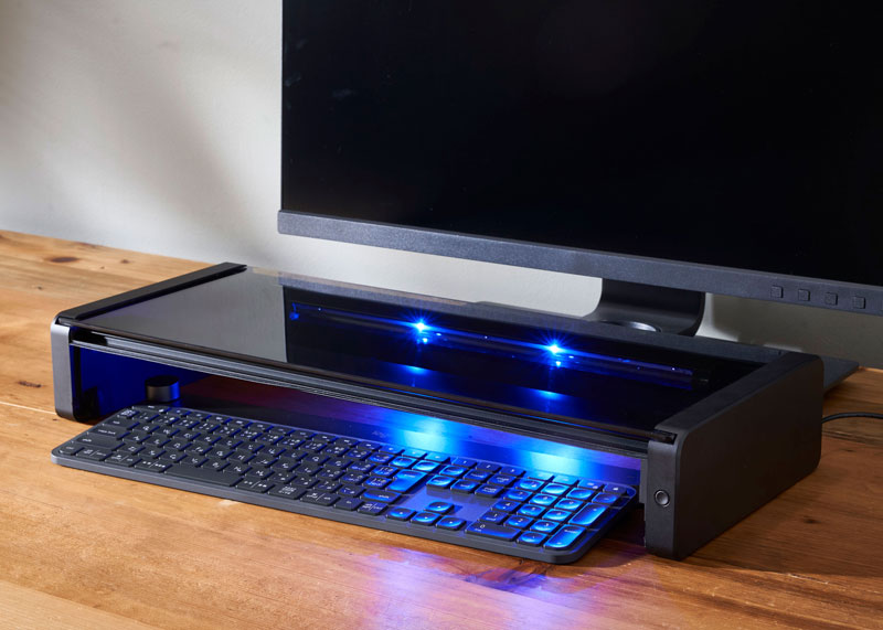 「UV除菌デスクボード」は、液晶ディスプレイを上に置くことで作業中の目線を上げ、姿勢の改善をサポートする机上台です。ガラス天板の下が収納スペースになっており、デスク上の整理整頓に役立つだけでなく、収納部に設置されたUV-C LEDの効果でキーボードやマウスなどの収納物を簡単に除菌することができます。