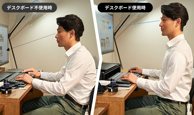 - 「UV除菌デスクボード」上に液晶ディスプレイを置けば自然と目線が上がり、作業中の姿勢の改善をサポートします。