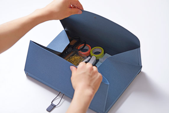 「ロッツ」フルオープンケースは、小物と書類を一つにまとめて持ち運べる薄型収納ケースです。開口部が大きく開くため、中身が取り出しやすい設計です。さらに、薄型なので小物同士が重なりにくく、収納物をひと目で確認できます。また、ケースを閉じると約3㎝の厚みになるので、かばんや書棚にもすっきり収まります。さらに裏面にも開口部があり、こちらを開けると書類だけをサッと出し入れできます。裏面には書類を出し入れできるポケットがあり、ケースを開くことなくサッと書類が出し入れできます。素材は雑貨感のある風合いが人気のクラフトペーパーを採用。約0.8mmの厚手の生地で、軽量ながら丈夫で持ち運びにも最適です。