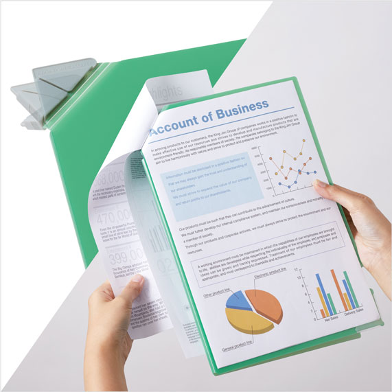 「ナナメクリファイル」は、ホチキス留めされた資料のように書類をナナメにめくれるファイルです。クリップを回転して書類を留めるだけで、最大約20枚までの書類を固定できます。書類を固定したままクリップが折り返せるので書類をナナメにめくることができ、閲覧しやすい仕様になっています。また、硬くて丈夫な表紙を採用しており、持った状態での記入・捺印も可能です。