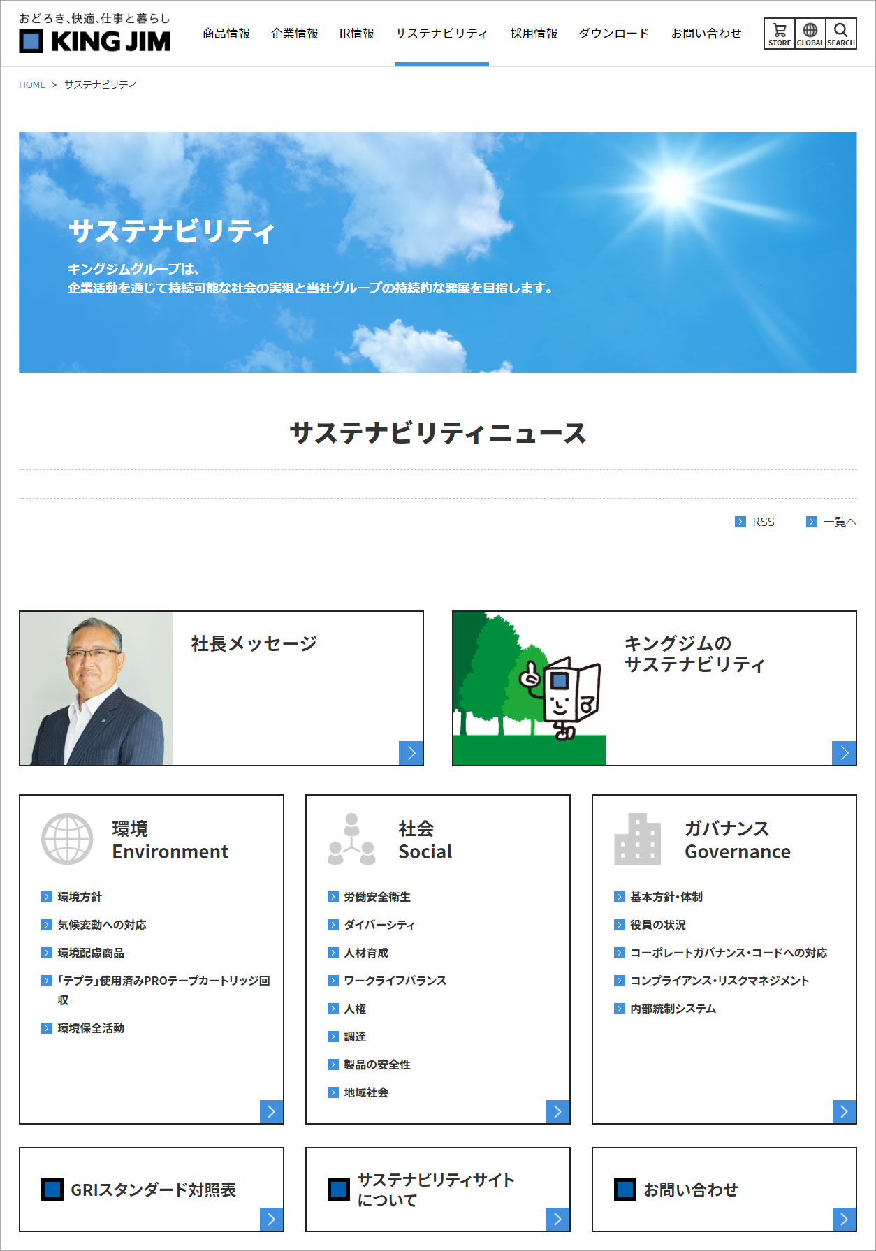株式会社キングジム(本社:東京都千代田区 代表取締役社長:宮本 彰)は、2022年11月18日、ESGやSDGsに対する社会的な意識の高まりを背景に、公式サイト内にサステナビリティサイトを新設いたしました。また、IR推進体制の強化に伴い、より充実したIR情報をご提供するためIRサイトを刷新いたしました。