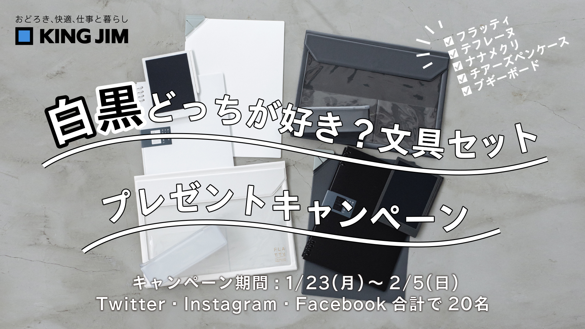 | キャンペーン概要 | Twitter、FacebookもしくはInstagramにて、キャンペーンにご参加いただいた方の中から抽選で合計20名様に、 「白の文具セット」または「黒の文具セット」をプレゼントします。 |