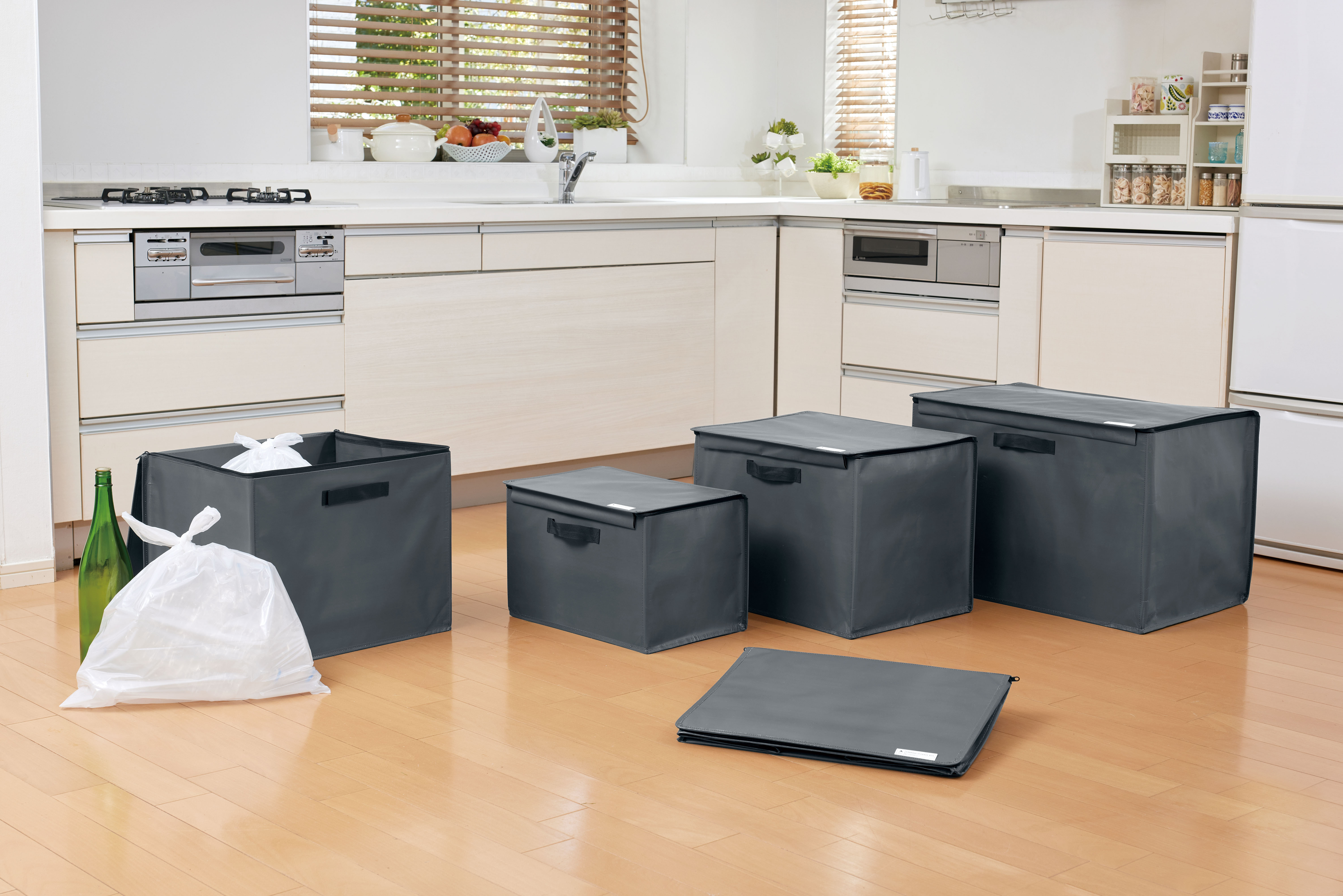 「ゴミストレージボックス」は、家庭ゴミを収集日まで一時保管できる収納ボックスです。ゴミの保管時はフタを閉めて気になるにおいを軽減でき、使わない時は折りたたんでコンパクトに収納できます。芯材入りで取っ手を引っ張るだけでサッと開けられ、ボックスの内側に触れずに組み立てやゴミの出し入れができて、衛生的です。レジャーシート素材のため、水を弾きお手入れも簡単です。またコンパクトで持ち運びやすく、玄関ポーチ、ベランダなどの家庭内だけでなく、キャンプやBBQでの一時的なゴミの保管にも便利です。サイズは生活スタイルに応じて使い分けられるS、M、Lサイズの3サイズ展開。カラーはインテリアにも馴染む、落ち着いた色合いのグレーの1色展開です。