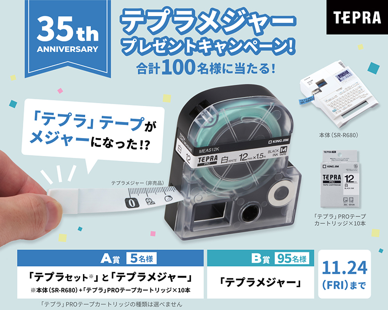株式会社キングジム(本社:東京都千代田区 代表取締役社長:宮本 彰)は、主力商品であるラベルライター「テプラ」の発売35周年を記念して、「テプラ」PROテープカートリッジ形状を忠実に再現した「テプラメジャー」を制作しました。今回、この「テプラメジャー」が合計100名様に当たる『「テプラ」35周年記念!「テプラメジャー」プレゼントキャンペーン』をキングジム公式SNSアカウント〔X(旧Twitter)、Instagram、Facebook〕で2023年11月17日(金)から11月24日(金)までの期間で実施します。