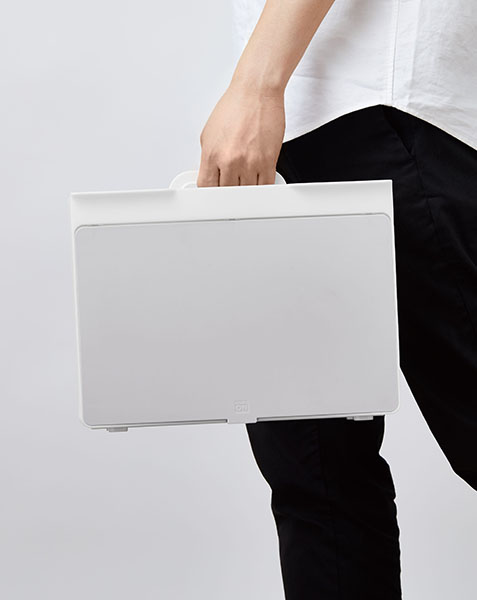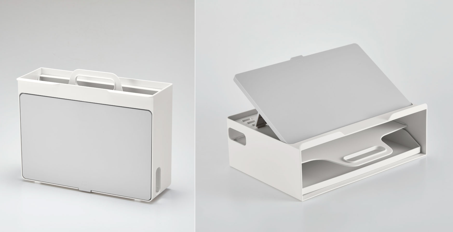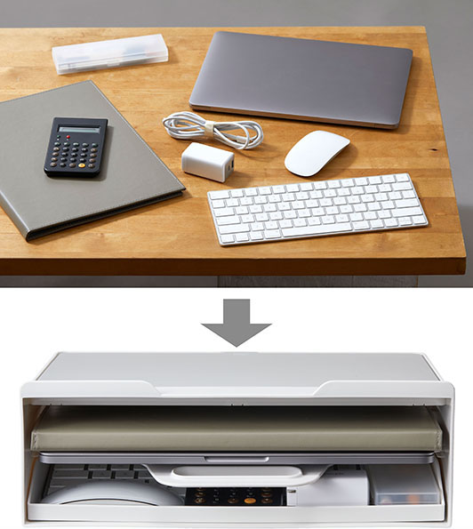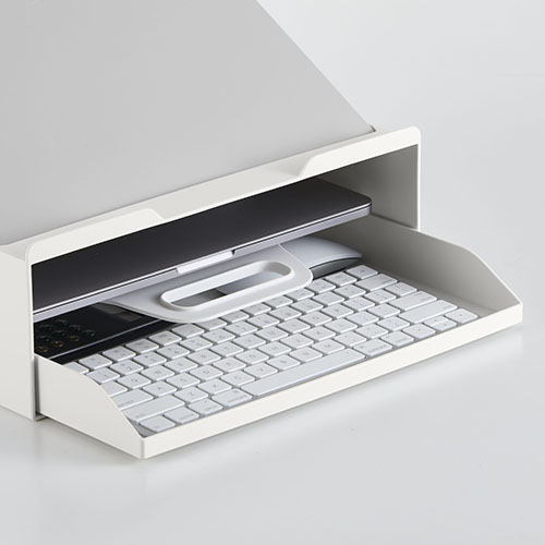 - PC作業に必要なアイテムをひとまとめにでき、作業時はスタンドを立ててノートPCをセットすれば、すぐに仕事空間を整えることができます。