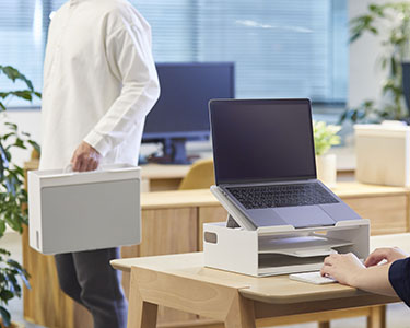 「ノッテオン」はワークツールをひとまとめにできる収納ボックスとしての機能と、ノートPCスタンドとしての機能を兼ね備えた製品です。フリーアドレスのオフィスや自宅でのテレワークなど、限られたスペースでも快適な仕事空間を作り出すことができます。