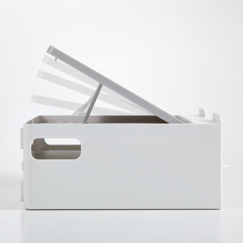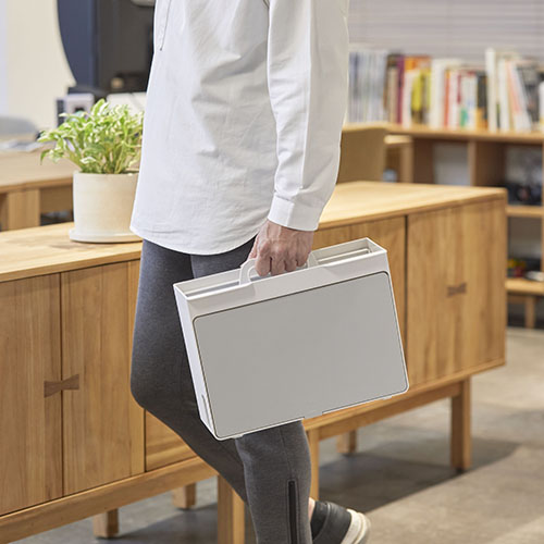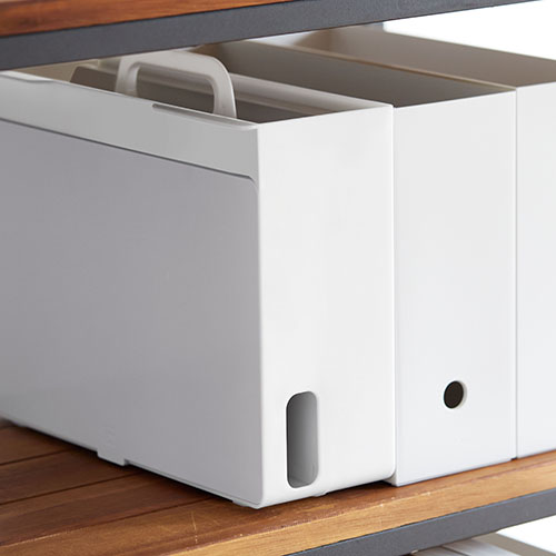 - 本体はA4ボックスファイルのサイズのため、棚やロッカーへ収納しやすい設計です。本体カラーはインテリアに馴染みやすいシンプルなシロを採用しています。