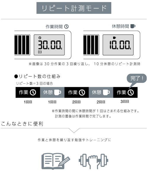 計測モードは、時間のカウントダウンとカウントアップができる「通常計測モード」と、作業時間と休憩時間のカウントダウンを指定した回数に応じて交互に繰り返す「リピート計測モード」の2種類から選択できます。また、消音機能付きで、音が出せない図書館などの静かな空間でも使用可能です。