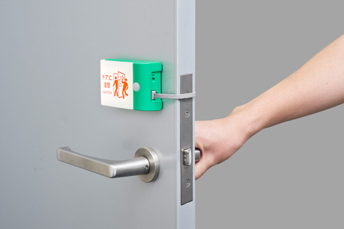「扉につけるお知らせライト」はマグネット式の本体を扉に挟むように設置します。有線タイプではライトで、無線タイプではライトとブザーで扉の反対側に人がいることを知らせます。
