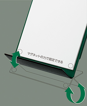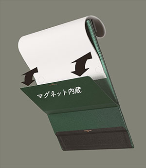 - 「底面フラップ」は書類の下側をマグネットで固定し、書類の不意な折れやめくれを防ぎます。未使用時は本体裏側に収納できるため、書き込みにも支障をきたしません。