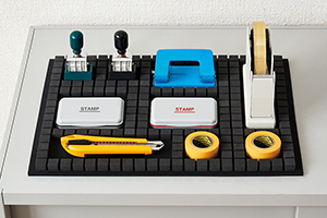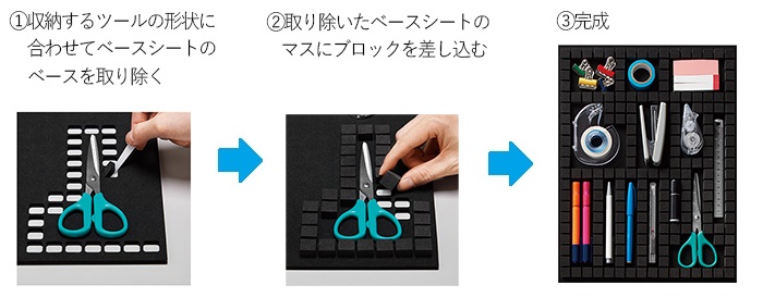「かたづけマス」は、ベースシートとキューブ型のブロックで構成されています。ベースシートにあらかじめマス目状に正方形の穴が空いていて、その穴にブロックを差し込むことで、ベースシート上に仕切りを作ることができます。ハサミやペン類、定規など、ツールの大きさや形に合わせて収納場所が作れるので、一目で片づける場所がわかるようになります。また、差し込んだブロックは何回でも抜き差しできるので、収納物を変えても自由にレイアウトを変更することができます。
