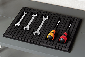 - 収納したいツールの形状に合わせてベースシートにブロックを差し込むだけで、ツールの定位置を作ることができます。オフィスデスクの引き出し内の整理はもちろん、工場現場などで備品の定位置管理に使用すれば一目でツールの有無がわかり、紛失・混入防止にも役立ちます。