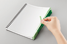 「インデックスノート」は、ミシン目の入った5つのインデックスが全てのページに付いているので、ページごとに必要なインデックスだけを残し、不要なインデックスを切り取ればテーマ別に分類・検索することができます。