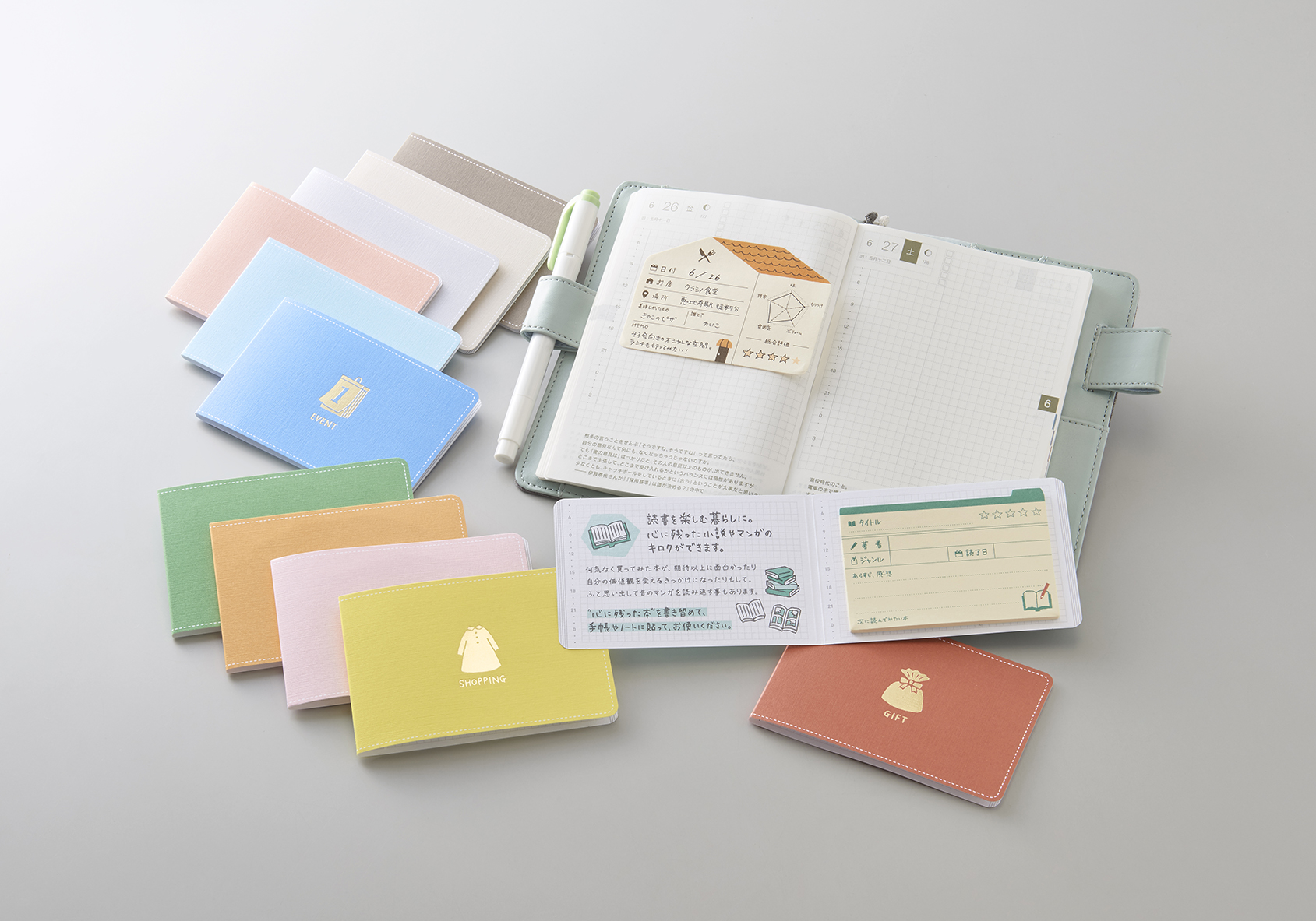キングジムはこのような点に着目し、手帳や日記に日常の暮らしの出来事を誰でも簡単に記録することができる、ノリ付きメモ「暮らしのキロク」を開発しました。メモのデザインは12種類で、ライフスタイルや残したい記録によって好きなテーマを選ぶことができます。例えば、食事をした店名、日付、味の評価を記録できる「RESTAURANT」や、読み終えた本のあらすじや感想を記録できる「BOOK」など、自分の趣味や目的に合わせてご活用いただけます。また、カードサイズのため、手帳カバーの名刺ポケットなどにストックして持ち運ぶことも可能です。