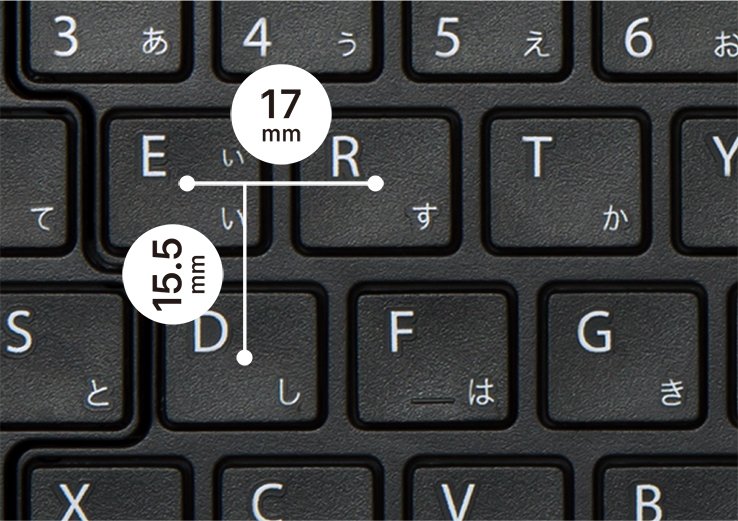 横17mm、縦15.5mmとゆとりのあるキーピッチ。コンパクトなボディにもかかわらず、ノートパソコン並みのキーボードを搭載。快適な打ち心地を実現しました。