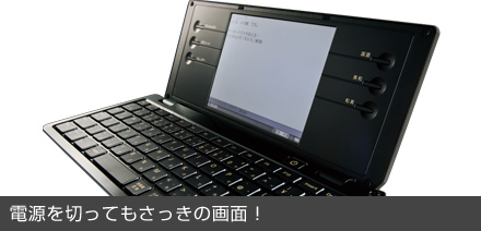 パソコンのように電源を切るたびに保存する必要はありません。電源を入れると先ほどの画面が表示されます。しかも電源は単4形アルカリ乾電池2本。コンビニエンスストアや駅の売店などで手に入るので、外出先での電池切れの心配もありません。