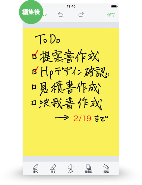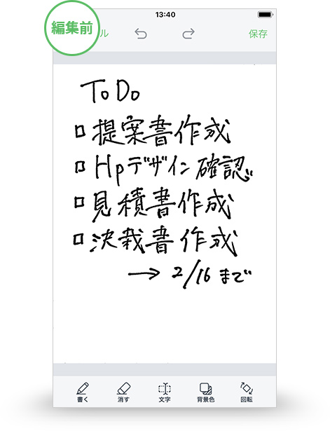 スキャンした画像は、「書く」、「消す」、「文字」、「背景色」、「回転」の項目で編集が可能です。