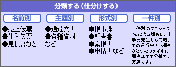 「分類」はファイリングを行うための基準で大・中・小の3つの分類が基準です。