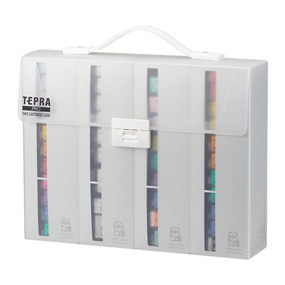 A4ボックスファイルサイズにテープカートリッジ(12mm幅40個)を収納。4つのボックスでテープ色・幅や種類ごとに整理できます。