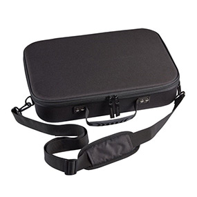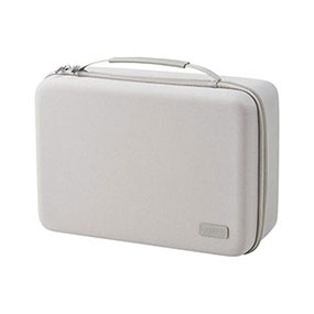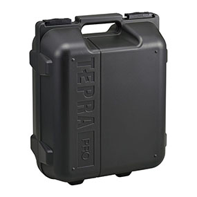 「テプラ」本体1台とACアダプタ、テープカートリッジ(12mm幅最大22個分)、取扱説明書などを収納可能。持ち運びに便利な肩掛けストラップ付き。