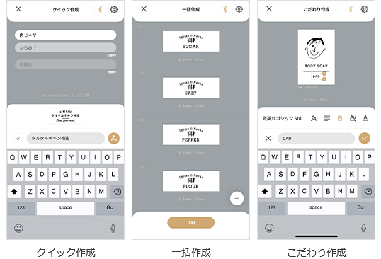 チャット感覚でテキストを入力し手早くラベルを作成する「クイック作成」や、ラベルのデザインを揃えて一度に編集・印刷できる「一括作成」など、目的に合わせて作成方法を選ぶことができます。
