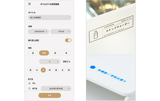 印刷したラベルに日時や曜日などアラーム設定を紐づけることができます。忘れがちなフィルター交換やゴミ出しの曜日、保存食の管理などにおすすめです。