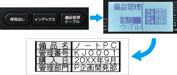 「背見出し」「インデックス」「備品管理・ケーブル」フォームにすぐアクセスできるビジネスフォームキーを搭載。
