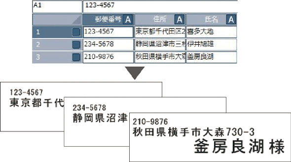 CSV形式やExcelなどで作成したデータベースをラベルに印刷できる「流し込み印刷」機能を搭載。データベースから宛名ラベルを大量に印刷するときなど、業務用途に活躍します。